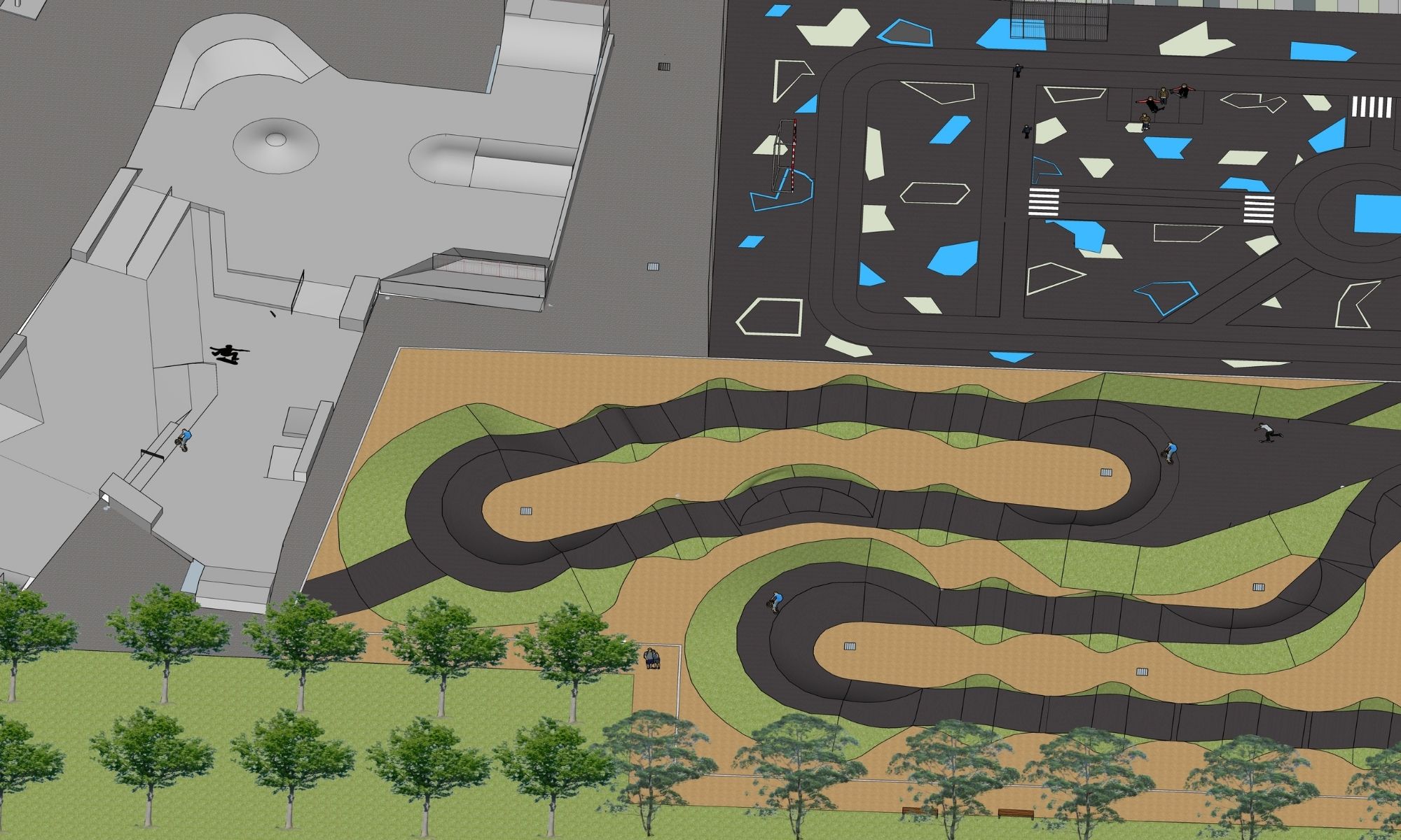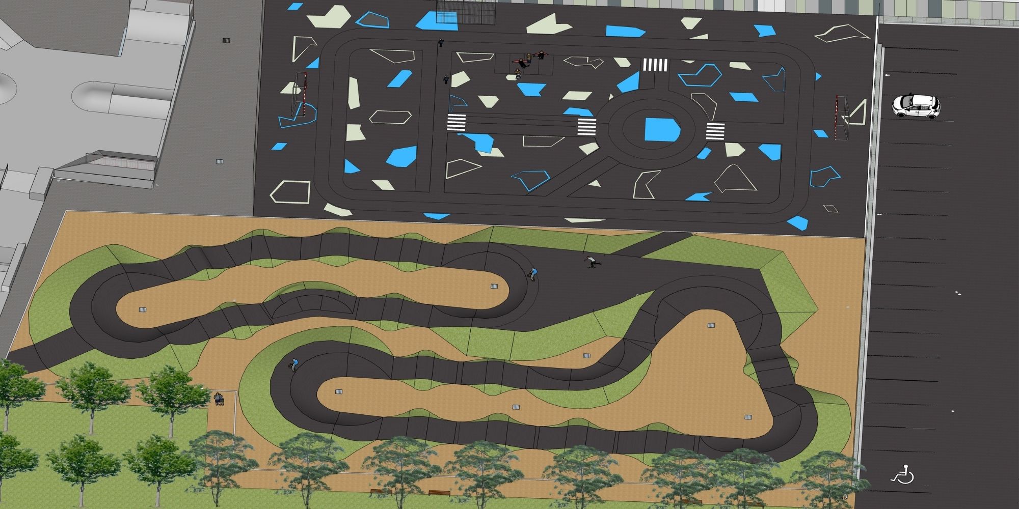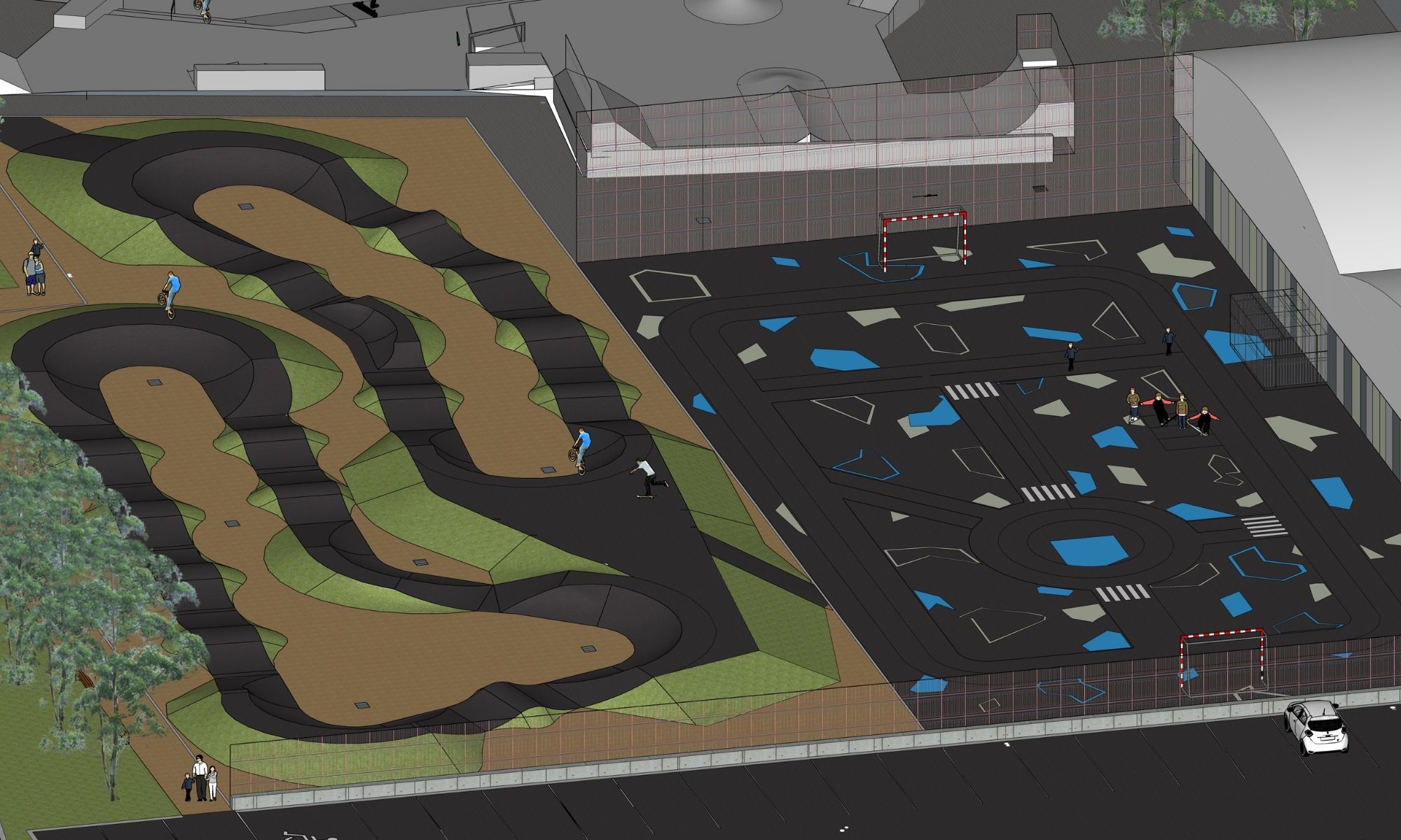 Descriptif : La pumptrack, située à côté du skatepark, vient enrichir l’offre de glisse urbaine.