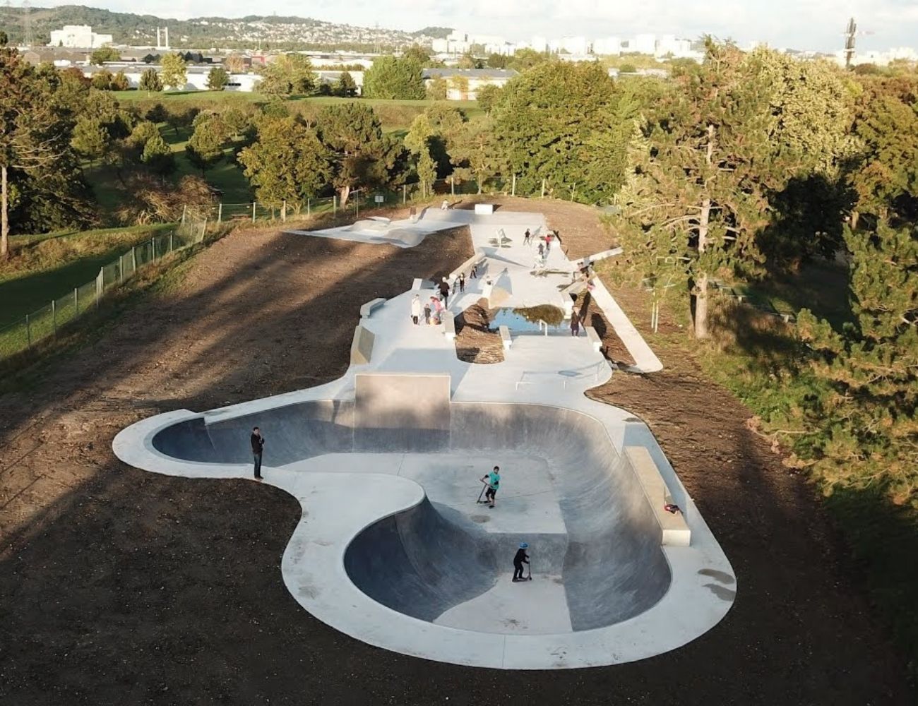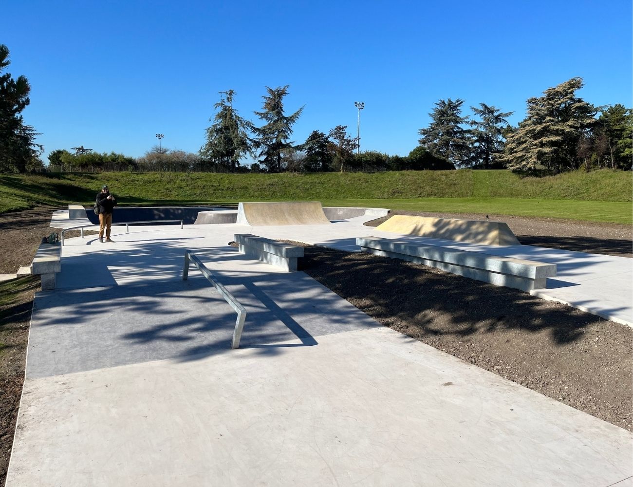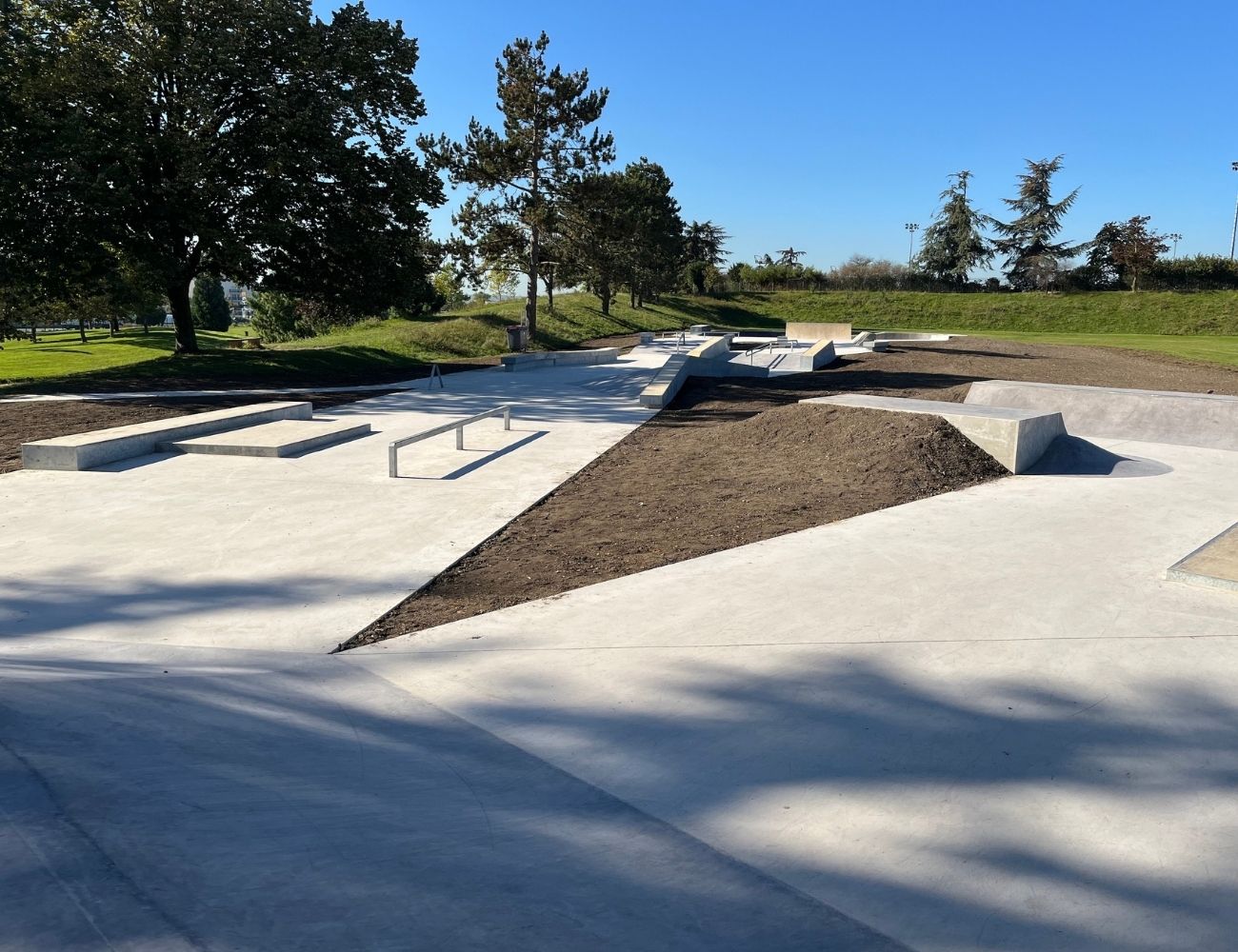 Descriptif : Un skatepark moderne et polyvalent en béton coulé sur place, pensé pour tous les niveaux. Son aménagement paysager crée un cadre agréable et convivial.